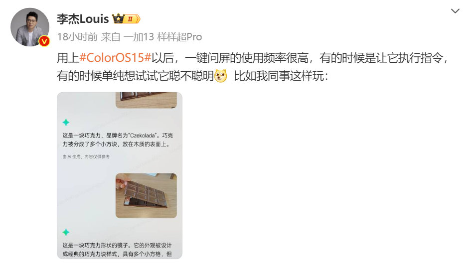 實際使用上,李杰稱,“用上ColorOS 15以后,一鍵問屏的使用頻率很高,有的時候是讓它執行指令,有的時候單純想試試它聰不聰明”。