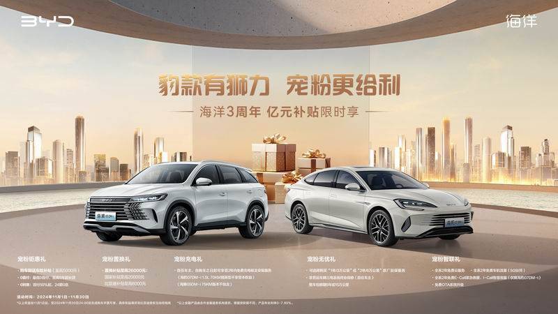 時(shí)值海洋網(wǎng)成立三周年,為回饋“海粉”的信賴與熱愛,海洋網(wǎng)推出“寵粉”大禮包,自2024年11月1日至11月30日,購買海豹07DM-i或海獅05DM-i,完成購車開票即可享至高5,000元保險(xiǎn)補(bǔ)貼。貼心的鉅惠好禮配合置換補(bǔ)貼,“最低0首付,至高5年超長貸”,“首付50%起,24期0息”,2年免費(fèi)車機(jī)流量,2年免費(fèi)云服務(wù)等多重好禮,讓高品質(zhì)的綠色出行體驗(yàn)更加觸手可及。具體詳情,歡迎咨詢海洋網(wǎng)當(dāng)?shù)亟?jīng)銷商。