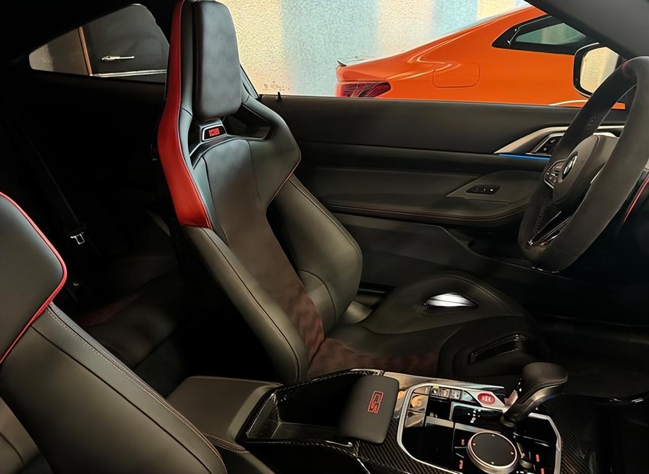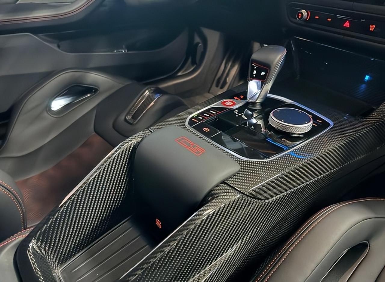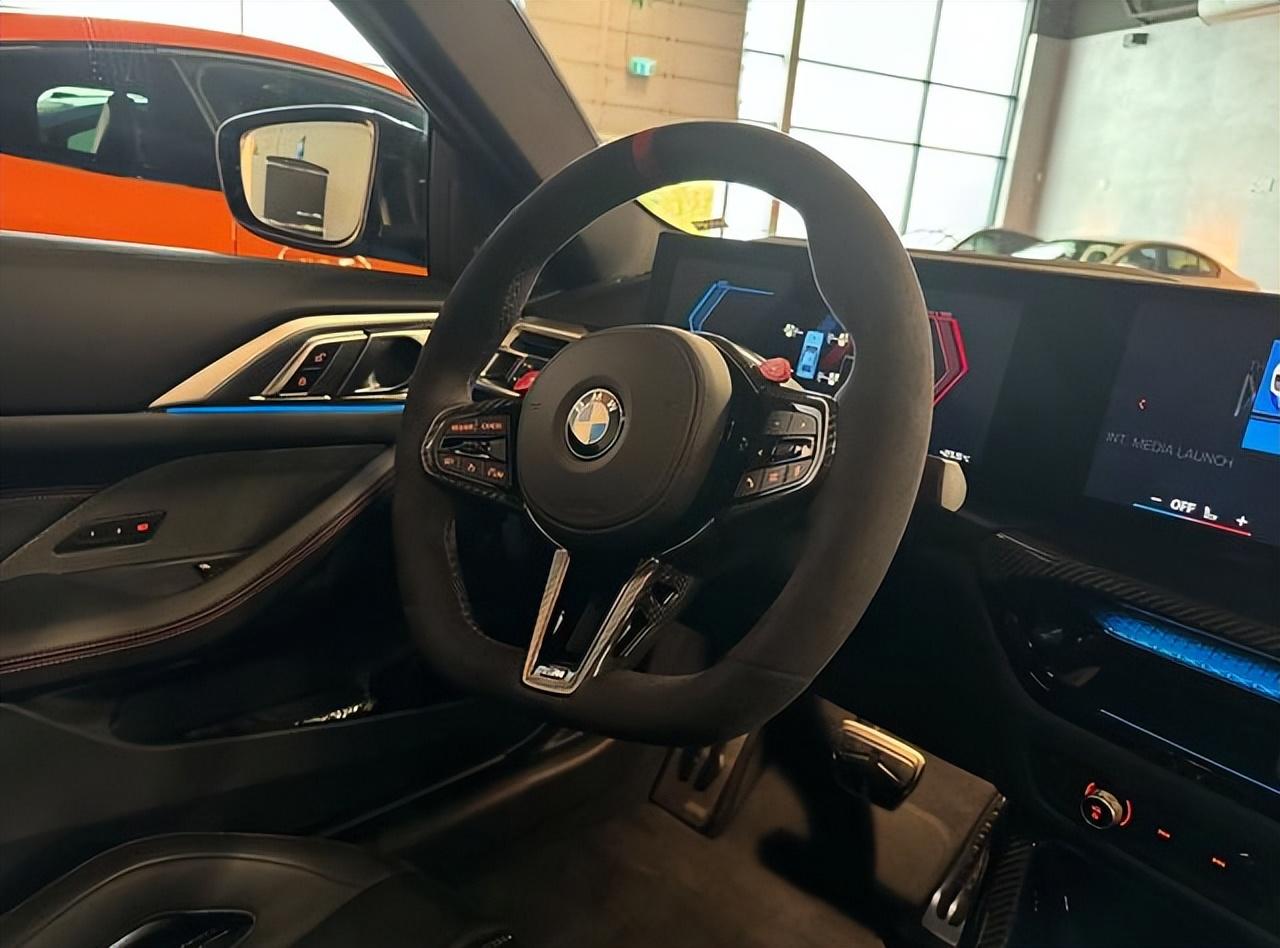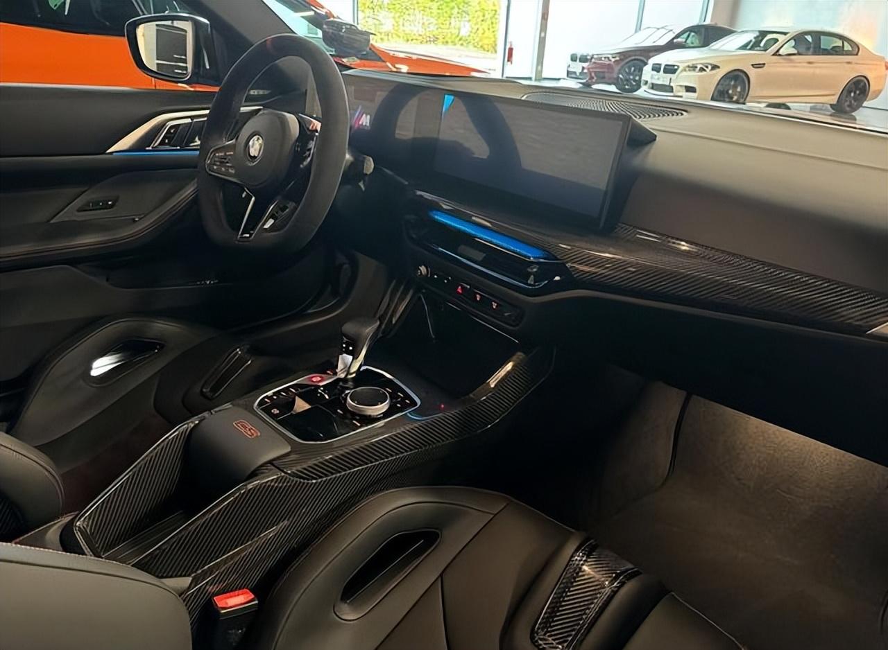 內(nèi)飾依舊是全黑灰色為主,黑色為輔、還有紅色裝飾元素的點綴。車內(nèi)采用了大面積淺灰色翻毛皮材質(zhì)鋪陳,還加入了大量碳纖維材質(zhì)的殼體,并帶有紅色的手工雙縫線設(shè)計。前排還配備了帶有掏空處理的一體式桶裝賽車座椅,三幅式多功能方向盤也加入了麂皮絨材質(zhì)包裹,12點方向還有紅色回正皮標。并加入了大尺寸換擋撥片和M+、M-撥片,營造出十分戰(zhàn)斗的賽車風格,進一步點燃駕駛激情。中控臺依舊搭載12.3英寸和14.9英寸的曲面雙聯(lián)屏,車機升級了智能語音助理,配備了M Drive系統(tǒng),可以顯示并優(yōu)化行車軌跡,控制車輛的M系列設(shè)置等。
