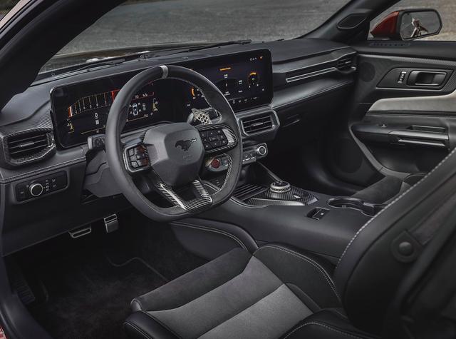 內(nèi)飾的設(shè)計(jì)布局與普通版Mustang幾乎保持一致,車內(nèi)采用了更加高檔的真皮材質(zhì)、Alcantara面料的交替混搭鋪陳,加入了精致的手工雙縫線設(shè)計(jì),還有大量碳纖維裝飾面板、銀色金屬裝飾元素,提升了整車的高級(jí)質(zhì)感。前排依舊配備了翻毛皮、碳纖維和真皮材質(zhì)的RECARO桶裝賽車座椅,帶來更好的包裹性和支撐性,并且更加輕量化。后排腿部空間更加寬敞,實(shí)用性很強(qiáng)。科技感方面,該車配備了13.2英寸彩色液晶儀表+12.4英寸懸浮式液晶中控屏組成的雙聯(lián)屏,新車首次應(yīng)用了福特全新的數(shù)字娛樂系統(tǒng),基于安卓系統(tǒng)打造,目前已經(jīng)全面支持OTA在線升級(jí)。