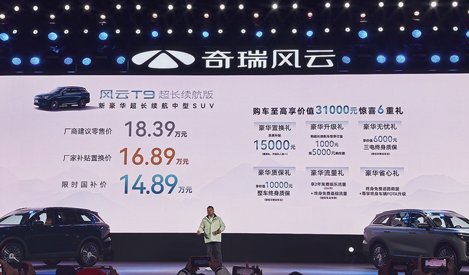 2024年11月18日,奇瑞插電混動(dòng)中型SUV風(fēng)云T9超長續(xù)航版在天津正式上車,新車官方指導(dǎo)價(jià)為18.39萬元,現(xiàn)在購車可享廠家提供的1.5萬元置換補(bǔ)貼,以及限時(shí)國家補(bǔ)貼,補(bǔ)貼后最終起售價(jià)為14.98萬元。此次改款,風(fēng)云T9長續(xù)航版主要更新了混動(dòng)系統(tǒng)的純電續(xù)航能力,CLTC純電續(xù)航從之前的120km提升到210km。伴隨新車而來的,還有豐富的購車權(quán)益。