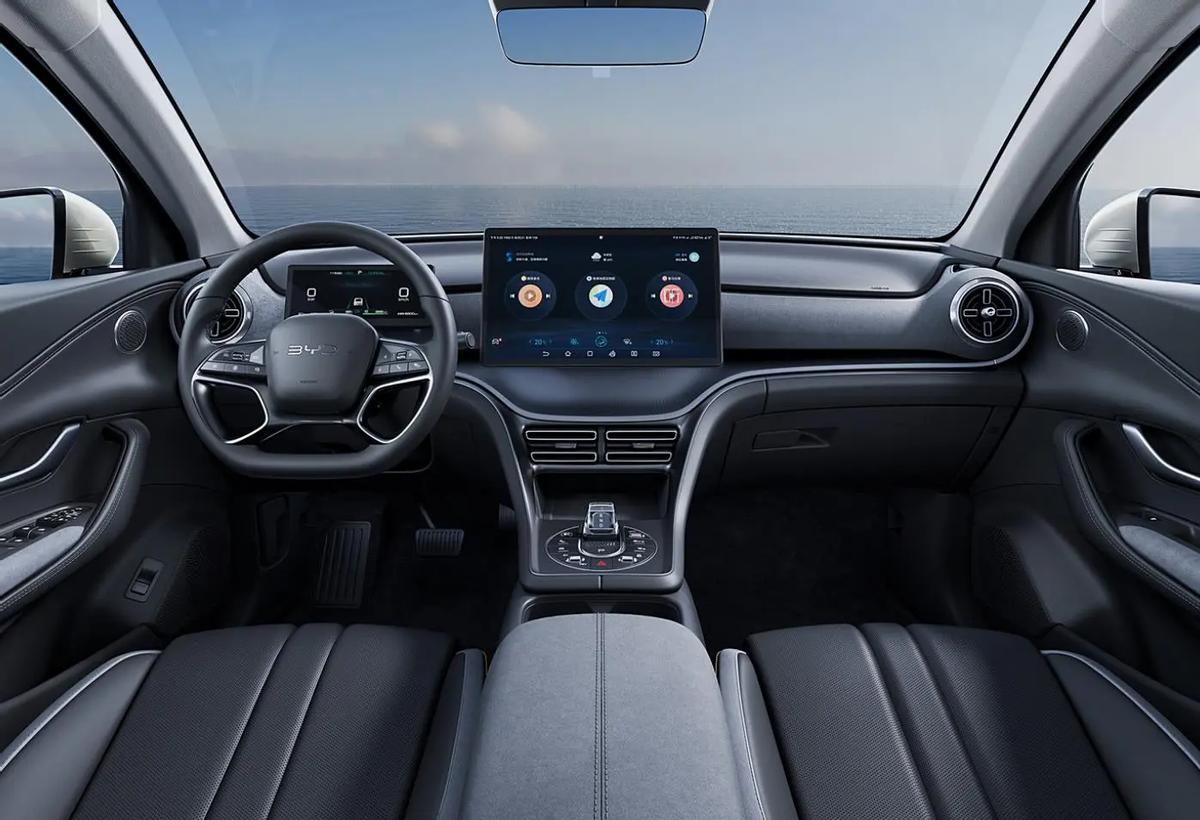 在內飾設計上,海獅05 DM-i采用了環抱式座艙設計,儀表臺與門板形成過渡,配備了全液晶儀表盤和可旋轉的15.6英寸中控屏幕。車機系統是比亞迪DiLink智能網聯系統,具備多樣化功能。內飾的整體設計體現了海洋美學的理念,顯示了比亞迪在不同產品線中的風格差異。