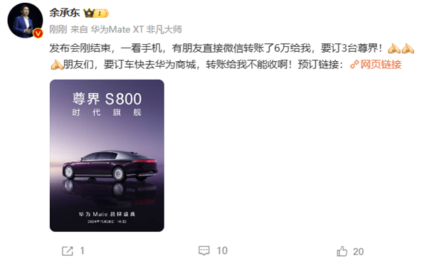 值得一提的是,在發(fā)布會結束后的當晚,華為終端BG業(yè)務董事長余承東便表示:自己的手機微信上已經收到了來自3位好友所發(fā)來的總計6萬元轉賬,由此可見,尊界S800這款車型熱度還是非常之高的。