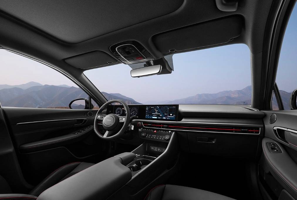 而N Line版車型更具運動氣息,擁有N Line專屬標識、紅色卡鉗、高性能米其林輪胎、19英寸刀鋒輪轂、競速導流尾翼、雙邊四出運動排氣等運動裝配,呈現出獨特的力量美學。車身尺寸方面,索納塔的長寬高分別為4945x1860x1445(1450) mm,軸距2875mm。