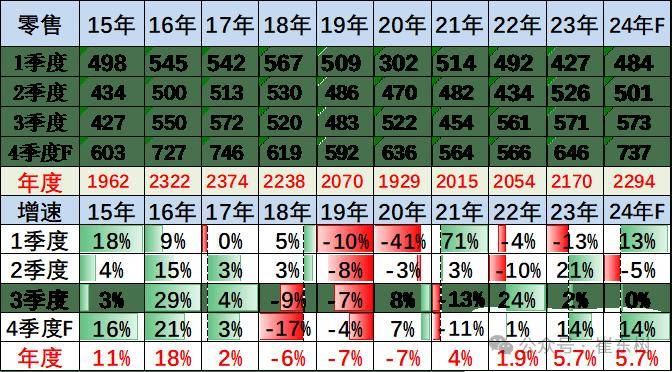 但隨著7月份政策的全面落地和力度加大,其刺激作用逐漸顯現。三季度車市重回零增長水平,四季度更是出現了爆發式增長。最終,2024年全年乘用車零售量預計將達到2294萬輛,同比增長5.7%。其中,四季度同比增速高達14%,與一季度相當。整個乘用車市場呈現出“U”型走勢。