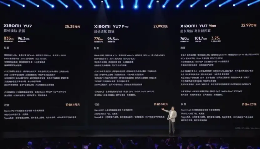 除標準版之外,小米YU7還有Pro版(起售價27.99萬元)和Max版(起售價32.99萬元)。