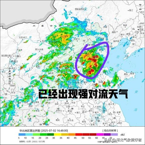 下午17時,在河北中東部,山東西北部已經出現了十分明顯的降雨云團,紅黃色回波覆蓋京津冀腹地。