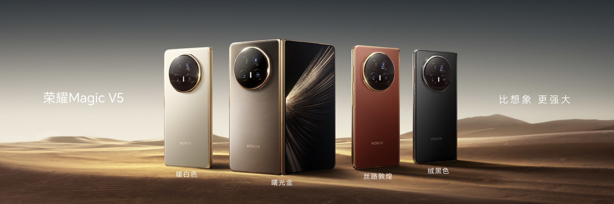 配色方面,榮耀Magic V5 帶來四款全新配色,以柏拉圖洞穴之寓為靈感的「曙光金」,充滿東方韻味的「絲路敦煌」,以及經典的「暖白色」和「絨黑色」,開合間盡顯科技與美的平衡。