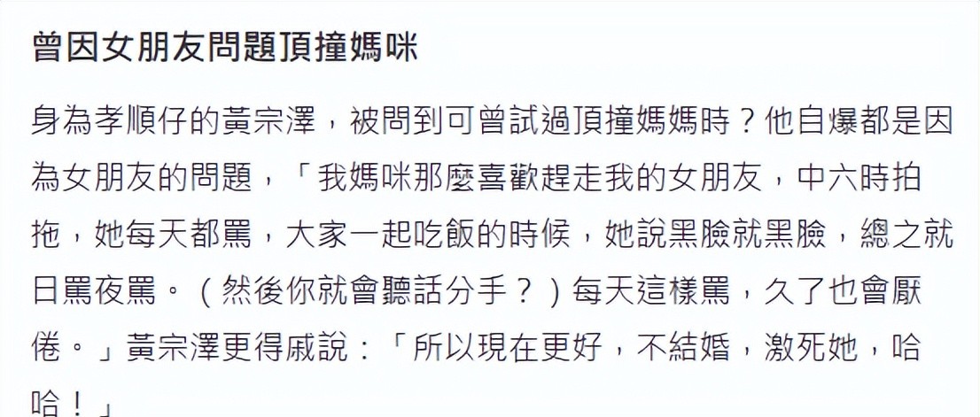 記者最近看到黃宗澤在采訪里說自己不愿意結婚,就是想氣媽媽。他說因為小時候談過女朋友,結果他媽媽一直反對,天天罵人,最后把女朋友逼走了。現在他44歲還不結婚,就是想讓媽媽難受。
