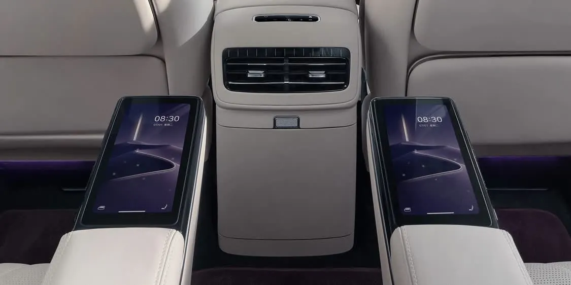 整車的中控部分則做成了中軸對稱布局,內飾中央放置了一塊 12.8 英寸 OLED 材質的瀑布曲面屏,兩側是 23.6 英寸儀表屏和 23.6 英寸副駕多媒體屏,后面有一塊 21.4 英寸的液晶折疊屏。