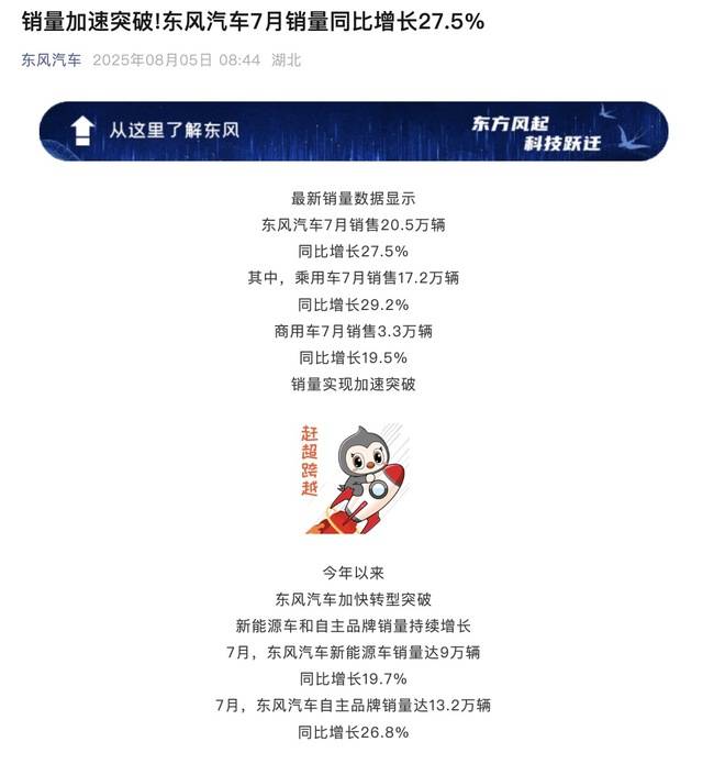 東風汽車在下半年伊始同樣加速突破上揚。最新銷量數據顯示,7月東風汽車銷售20.5萬輛,同比增長27.5%;其中,乘用車7月銷售17.2萬輛,同比增長29.2%;商用車7月銷售3.3萬輛,同比增長19.5%。值得注意的是,東風新能源和自主品牌銷量持續攀升,嵐圖汽車、奕派科技在7月銷量增幅均超過9成,猛士科技7月銷量增長74.1%。而在出口方面,東風汽車同樣保持穩步增長,7月出口達2.16萬輛。