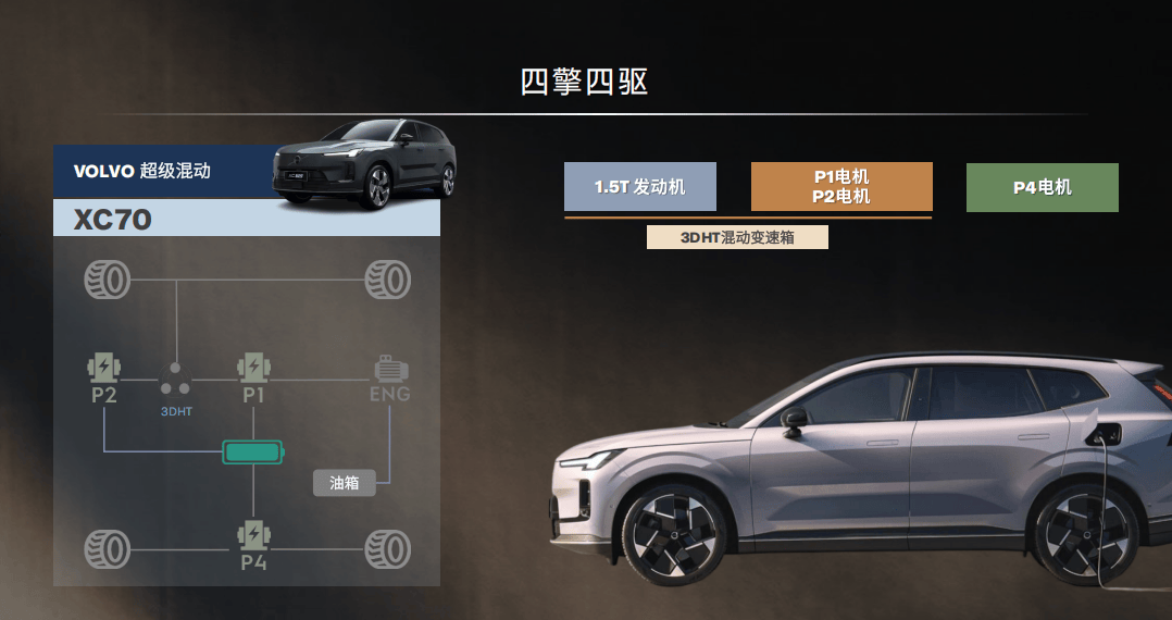 首次搭載該平臺(tái)的沃爾沃全新XC70采用P1+P2+P4技術(shù)路線,P1電機(jī)、P2電機(jī)以及變速箱采用同軸布局,低速用電、中速混動(dòng)、高速直驅(qū),全程無(wú)感切換。