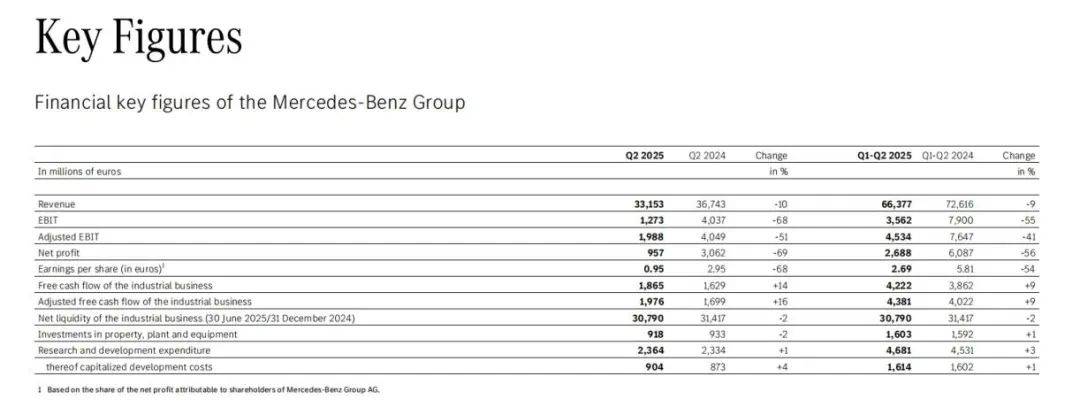 2025年上半年,梅賽德斯-奔馳集團(tuán)的成績單可謂壓力不小。財報顯示,集團(tuán)營收663.8億歐元,同比下降8.6%;凈利潤26.9億歐元,同比下滑55.8%。單看數(shù)字,這是一份頗為吃緊的半年報,但放眼整個豪華車行業(yè),奔馳的挑戰(zhàn)并不孤單。