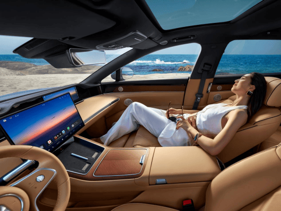 我們再來看看座艙內,首先在內飾顏色上,提供赤茶橘、白沙杏、松露棕、琥珀棕四色可選,并且內飾樣式也有變化,儀表臺上方為一個貫通的區(qū)域,副駕新增了12.3寸副駕屏以及125°零重力座椅,解決了此前享界S9副駕乘坐體驗的痛點,很顯然這次的重心從后排挪到了前排,更符合大多數人的用車需求。