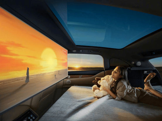 而且說它能裝,不僅僅是外觀方面,并且人家裝載能力確實強,常規(guī)容積,最大擴展容積可達1677L,這也讓后排幕布屏有了更好的使用場景,沒錯,就是放倒后排趴在大床上看,那可比坐著要舒坦多了。