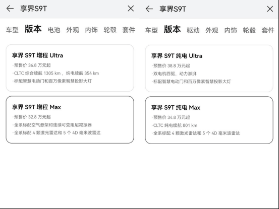 配置劃分上,享界S9T純電版和增程版都分為Max和Ultra兩個配置層級,增程Ultra相較于Max換裝了53度大電池,純電續(xù)航里程提升至354km,并可選黑曜套件,而純電Ultra相較于Max則是動力升級為雙電機四驅。