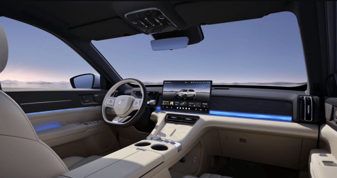 動力上,基于昆侖超級混動平臺,搭載鯤鵬超能混動C-DM系統,匹配1.5T增程混動發動機與無級超級電混DHT變速系統。綜合輸出功率265kW,百公里加速7秒級,60-100km/h加速4.1秒。CLTC純電續航220km,綜合續航超1500km。75千瓦快充20分鐘可將電量從20%充至80%,有6.6千瓦外放電功能。