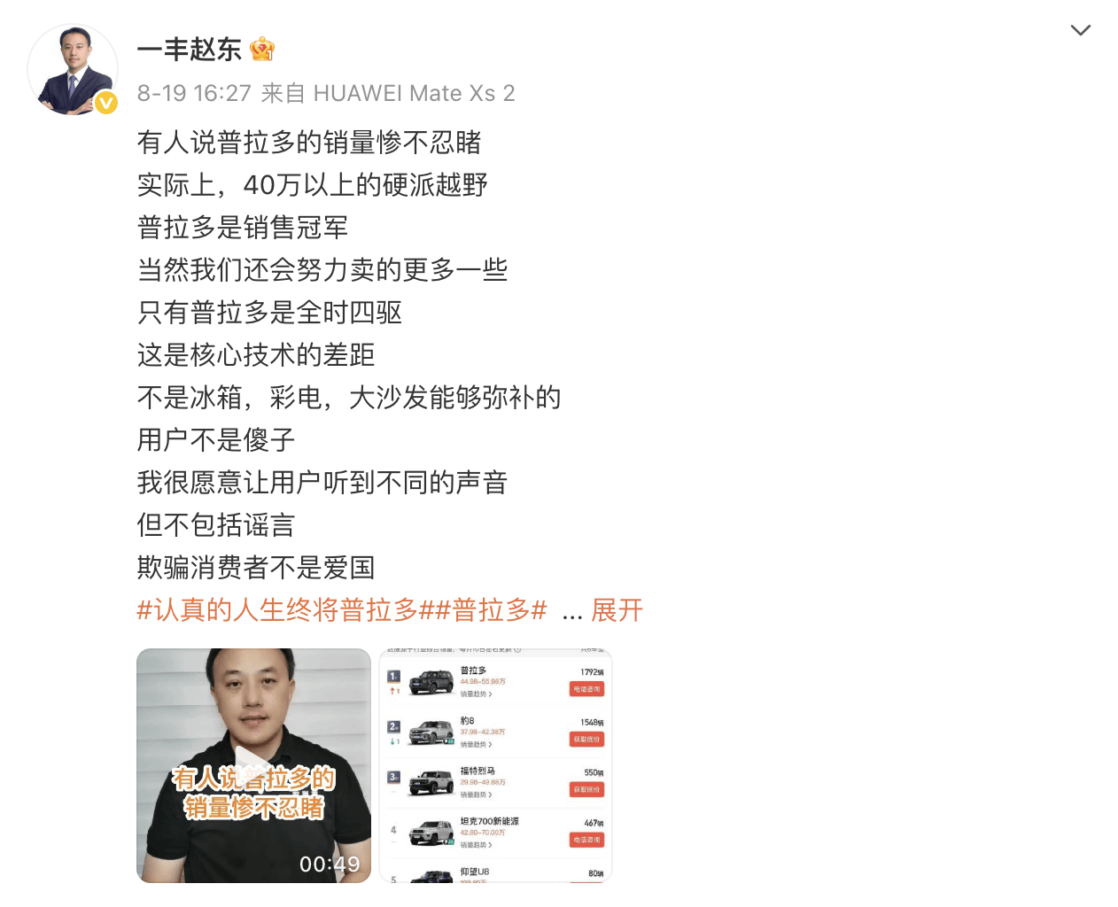 但是一汽豐田高管不服,一汽豐田企劃部部長趙東在社交平臺上表示,普拉多依然是40萬越野車銷冠,有人說普拉多配置低,但是只有普拉多是全時四驅,這是核心技術的差距,是冰箱、彩電、大沙發不能比的,并表示用戶不是傻子,欺騙消費者不是愛國……