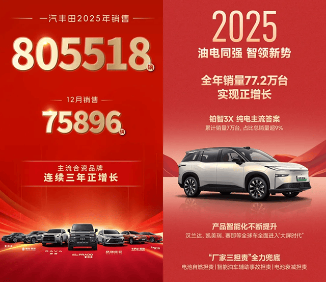 2025年的中國汽車市場,在新能源滲透率持續走高、自主品牌強勢崛起的存量競爭中,合資品牌集體承壓,而豐田卻交出了一份逆勢增長的答卷——兩大合資公司全年合計銷量157.82萬輛(一汽豐田銷量80.5萬輛,廣汽豐田銷量77.2萬輛),同比微增2.1%,成為少數實現正增長的主流合資品牌。